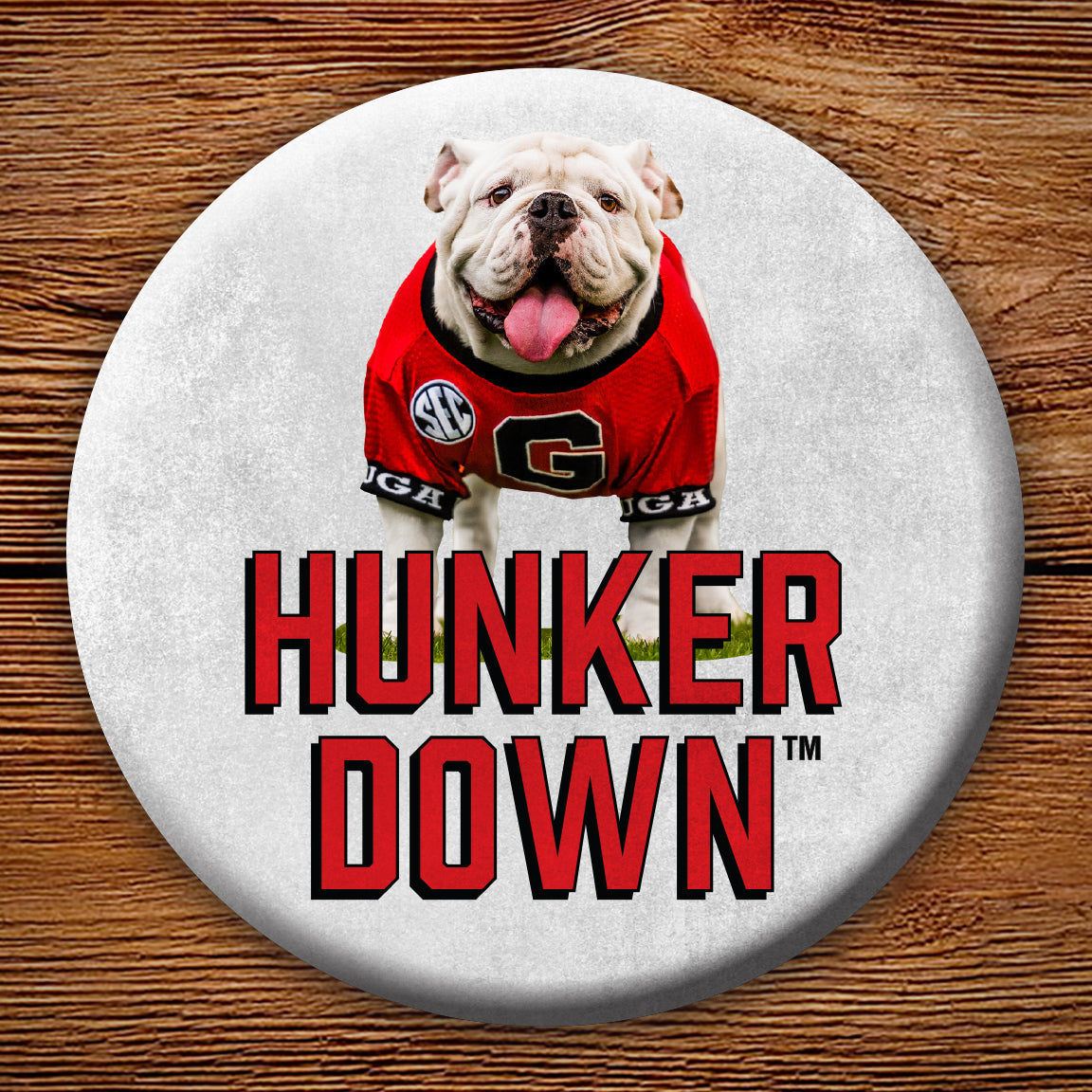 Uga X Mascot Hunker Down 3" Pin-Back Button - Georgia Bulldogs Tailgating & Gifts